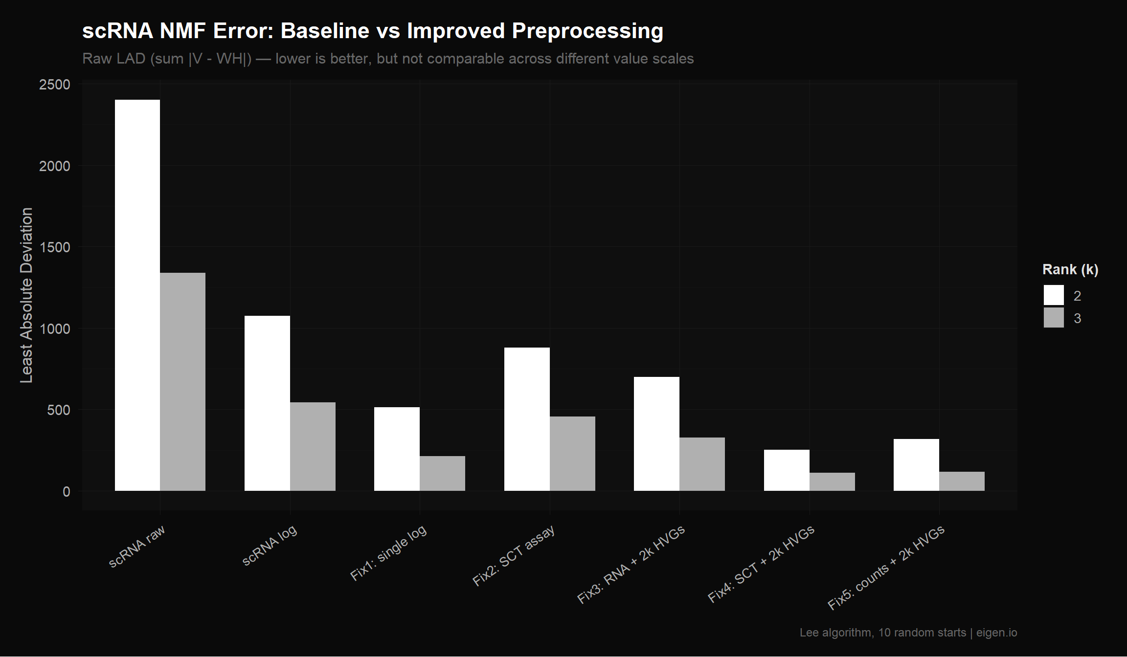 We use LAD (Least Absolute Deviation = sum|V - WH|) as our error metric because that’s what MEGPath optimizes. However, R’s Lee algorithm actually optimizes Frobenius (squared error), so we’re measuring LAD on a solution that wasn’t optimized for LAD. The absolute numbers will differ from MEGPath, but the relative ranking between preprocessing approaches should hold — a cleaner input matrix helps any NMF algorithm.