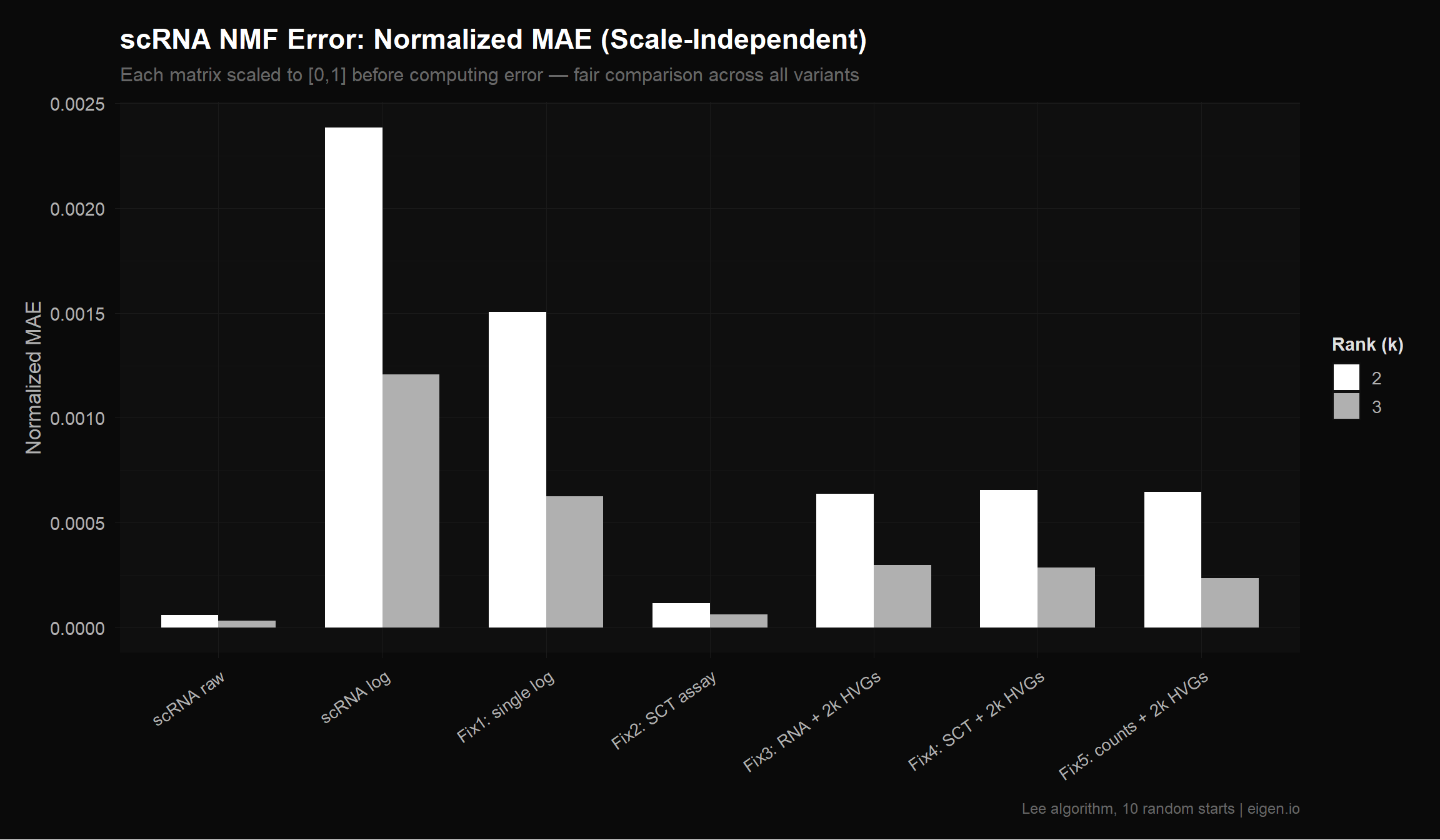 title = "scRNA NMF Error: Normalized MAE (Scale-Independent)",