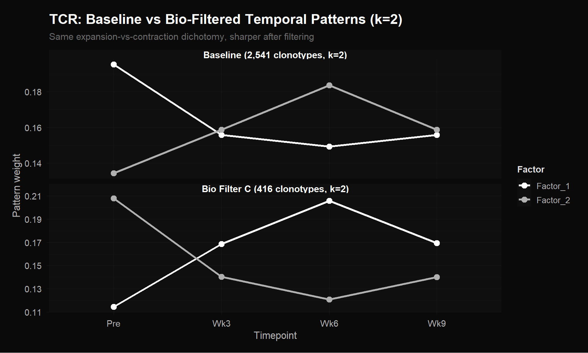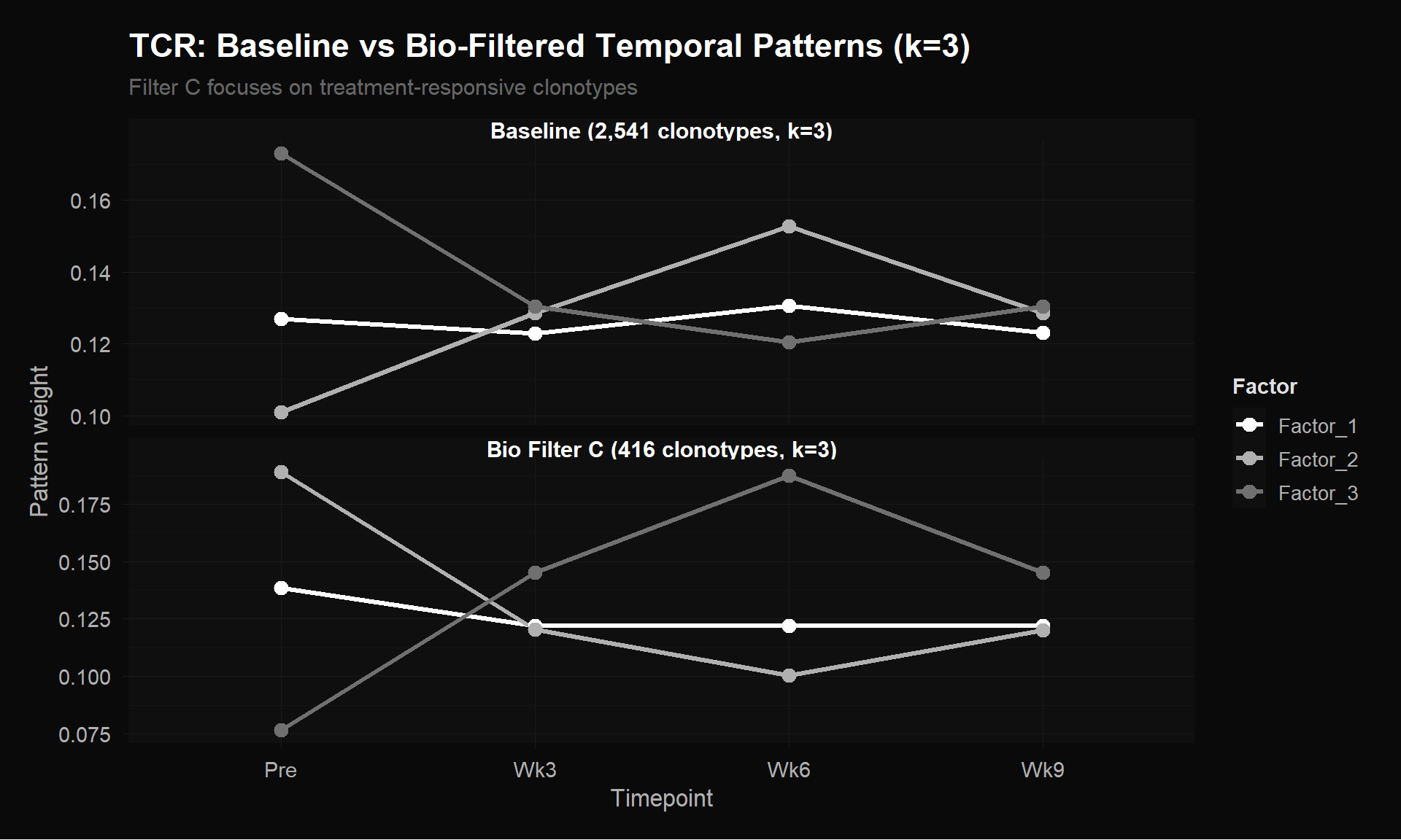 At k=3, the baseline (top panel, 2,541 clonotypes) shows weak, compressed patterns — all three factors hover between 0.10 and 0.17 with mild variation. The ~2,100 single-timepoint clonotypes (96% zeros) act as dead weight, washing out the signal from the ~400 biologically relevant ones. The bio-filtered version (bottom, 416 clonotypes) has much wider separation between factors (range 0.077–0.189) and sharper temporal contrasts. The three distinct programs (stable, contracting, expanding) are clearly resolved.