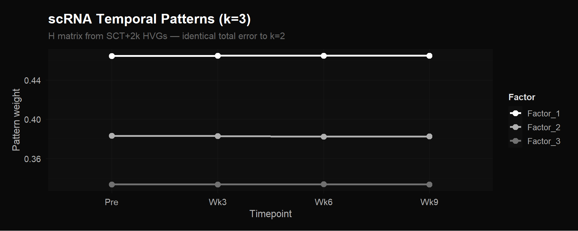 cat("1. TCR NMF works: Factor 3 peaks at week 6, independently recovering\n")1. TCR NMF works: Factor 3 peaks at week 6, independently recovering