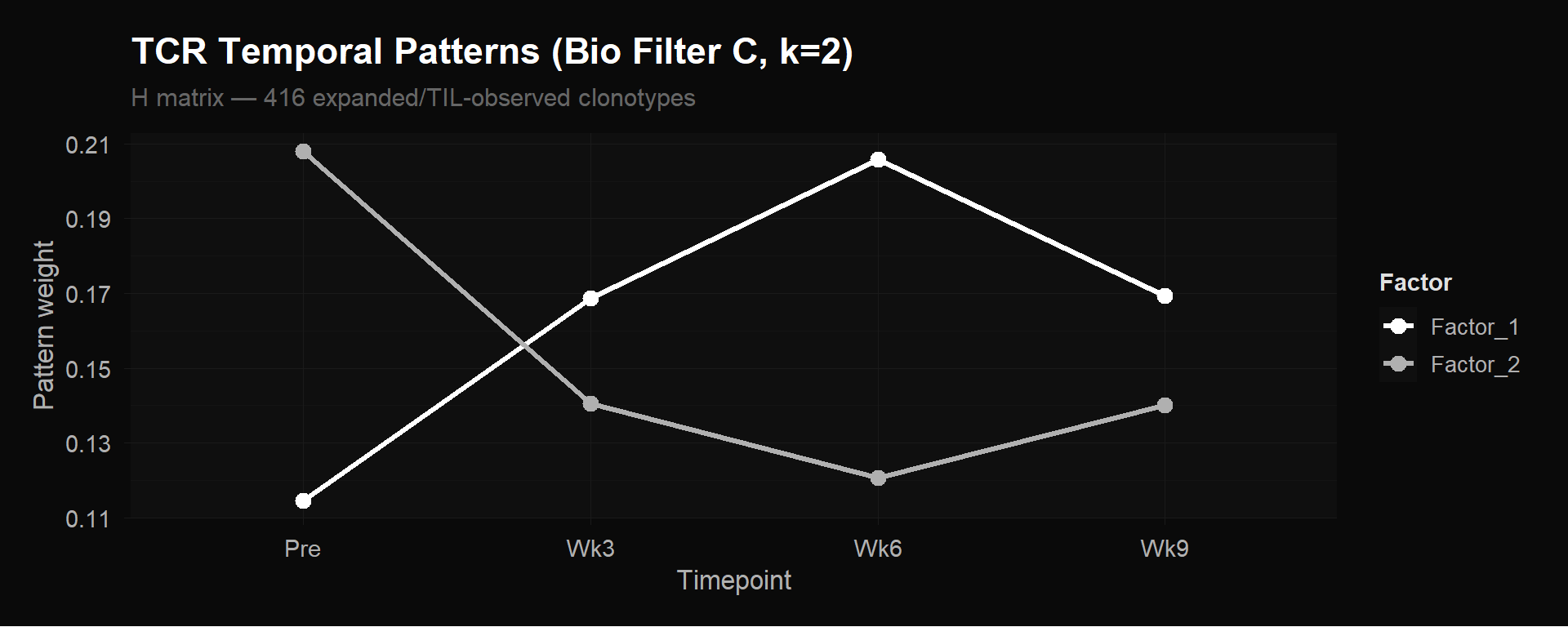 All six key clonotypes are assigned to Factor 3 — the treatment-responsive expansion factor that peaks at week 6. Every single one. This is NMF independently recovering the paper’s central finding: the clonotypes that expand during chemo-immunotherapy, that are found in the tumor biopsy (TIL-observed), and that correlate with CX3CR1+ effector differentiation, all follow the same temporal program.